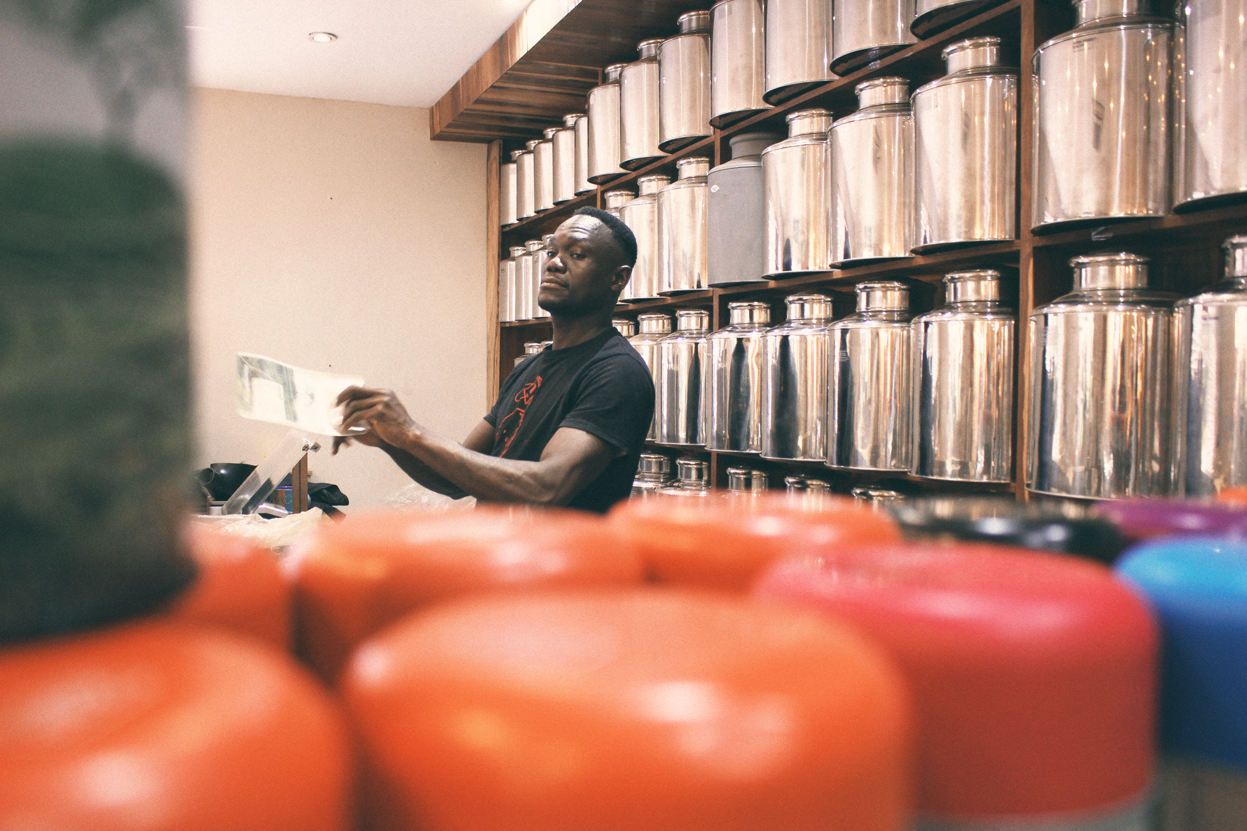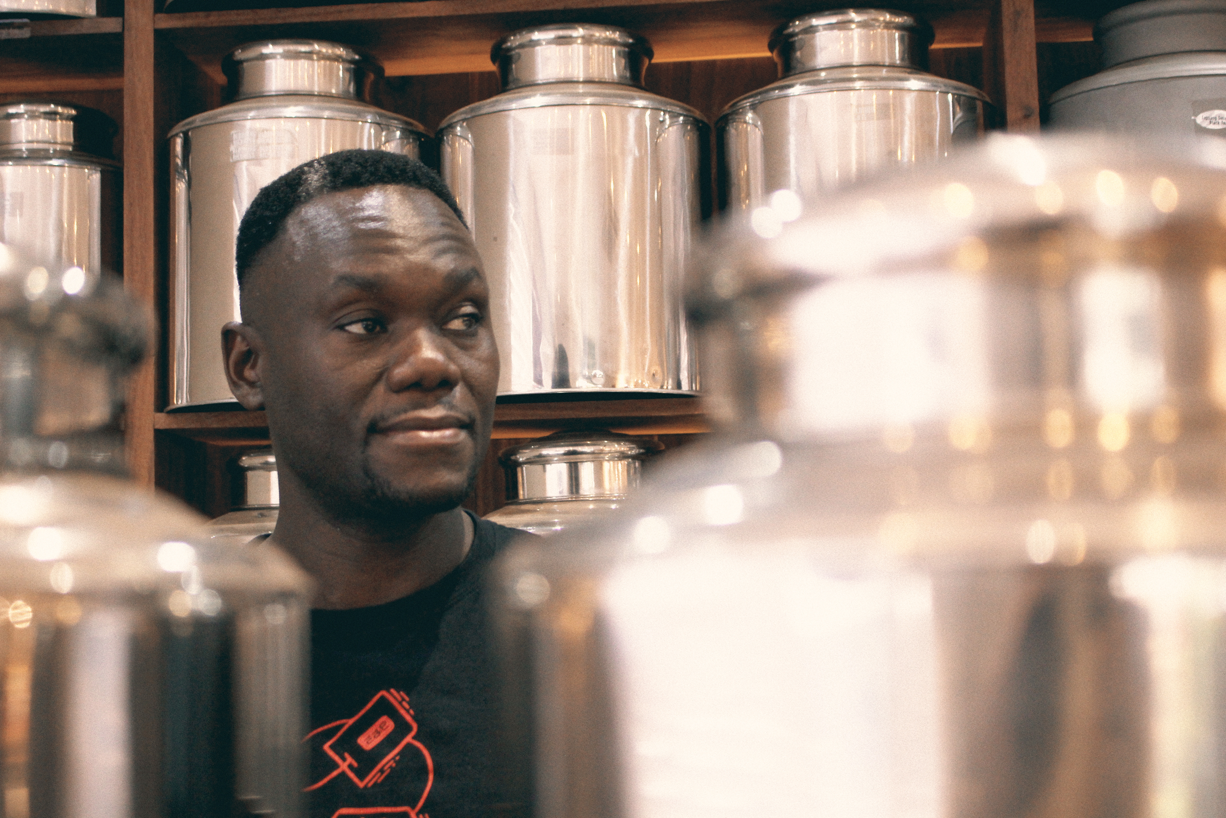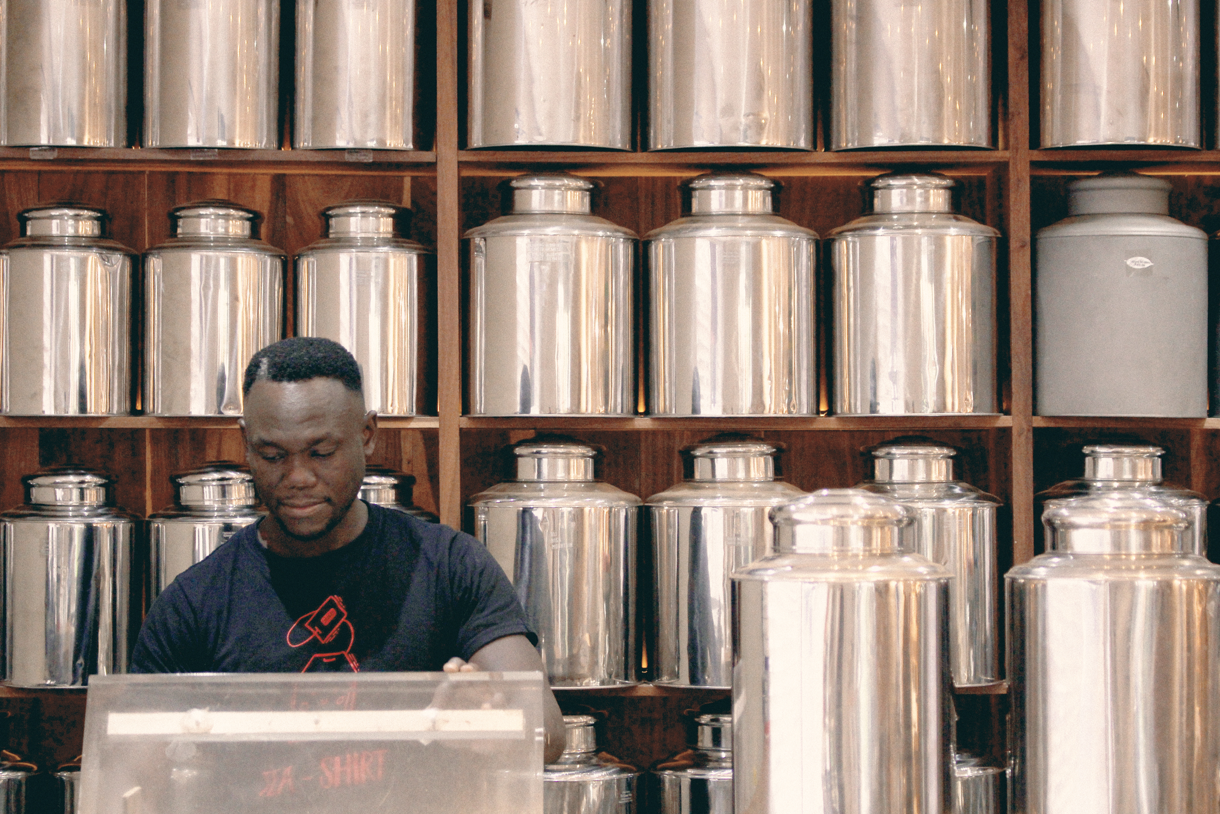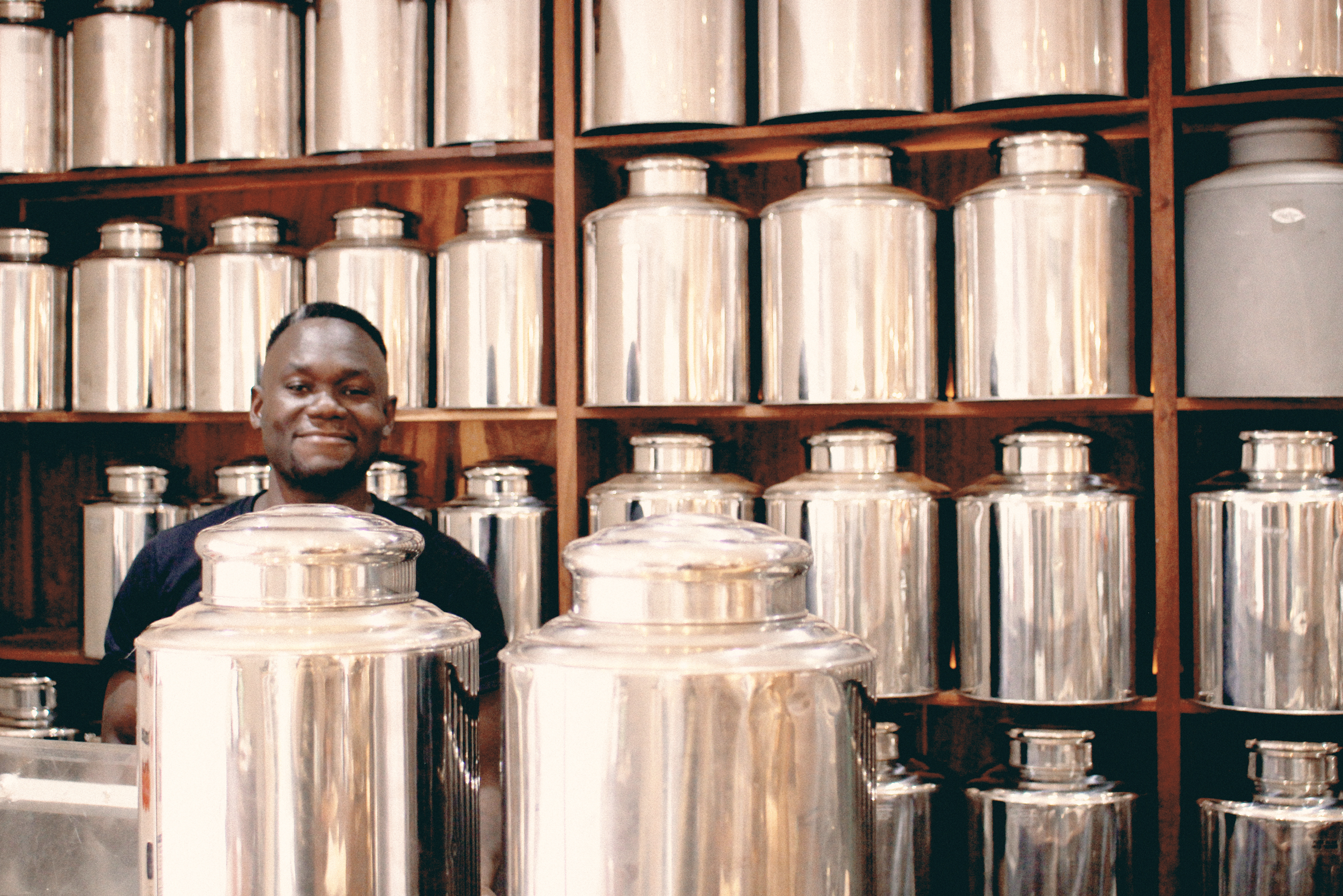 As you enter our teacafe in Cape Town, you will be greeted by the sight of sixty large, shiny tea cans, each holding a unique recipe for your peaceful and joyful experience. In front of these tea cans, you will often see a calm gentleman packing tea, ready to share his knowledge and passion with you.